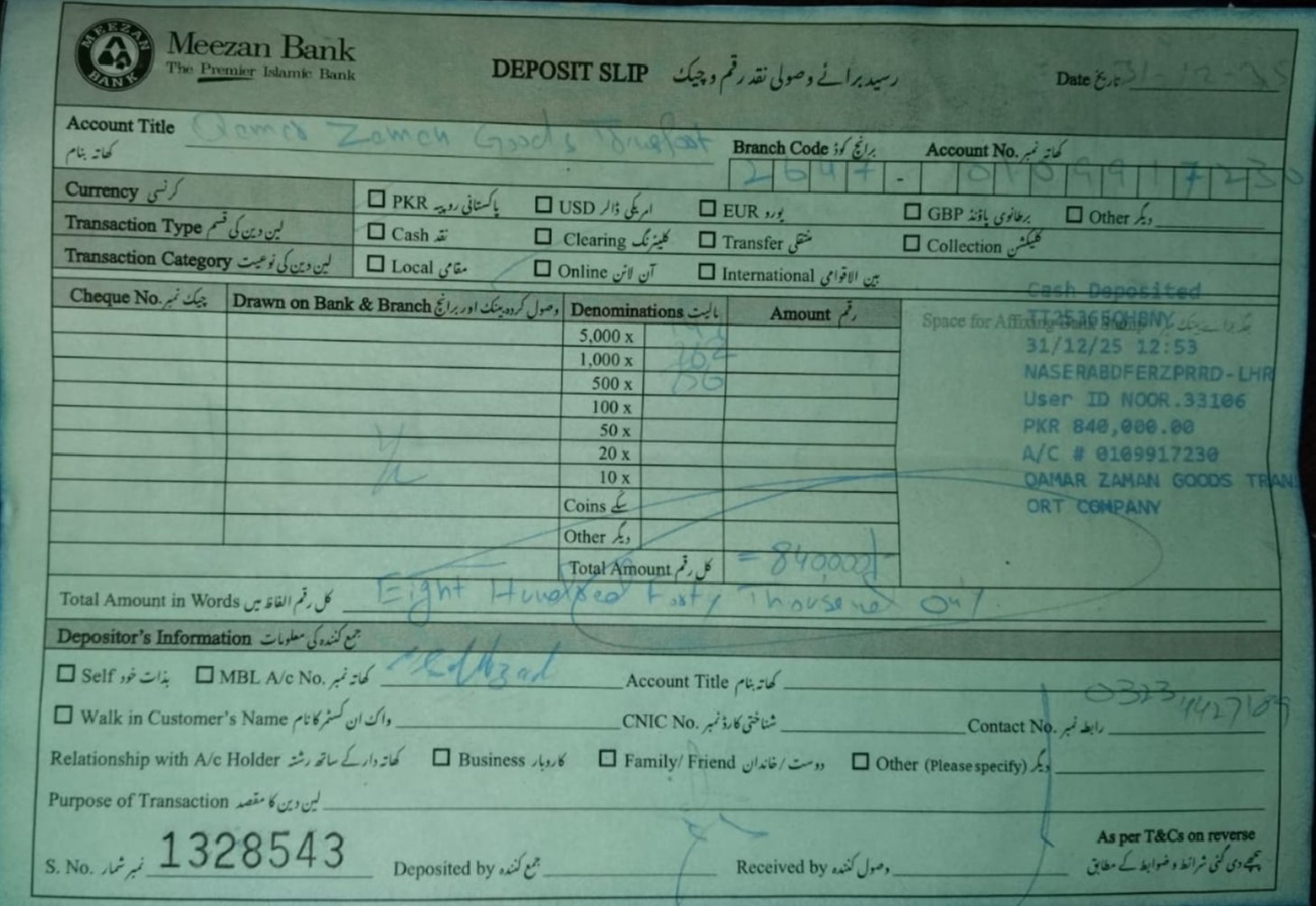 | 2025-12-01 | | 0000 | WARE-HOUSE | QASOOR | KARACHI TO KASUR | 3 | 840000 | 0 | 840000 | 50400 | Online | 840000 | 2026-01-01 | Cheque | 0 | | | 50400 |