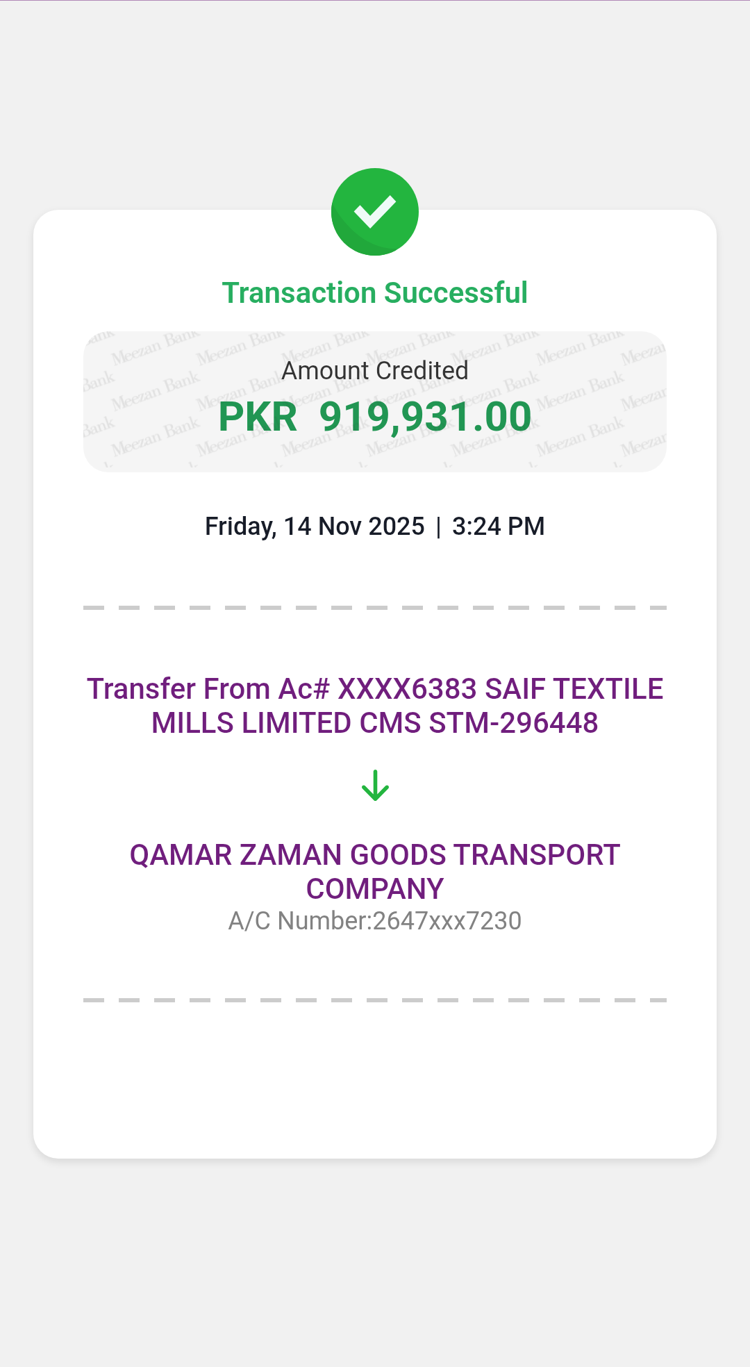 | 2025-06-13 | | 12840378 | SAIF TEXTILE MILLS LIMITED | GADOON | shahkot to gadoon | 7 | 772000 | 115800 | 887800 | 35512 | Online | 852288 | 2025-07-22 | Cheque | | 35512 | 115800 | |