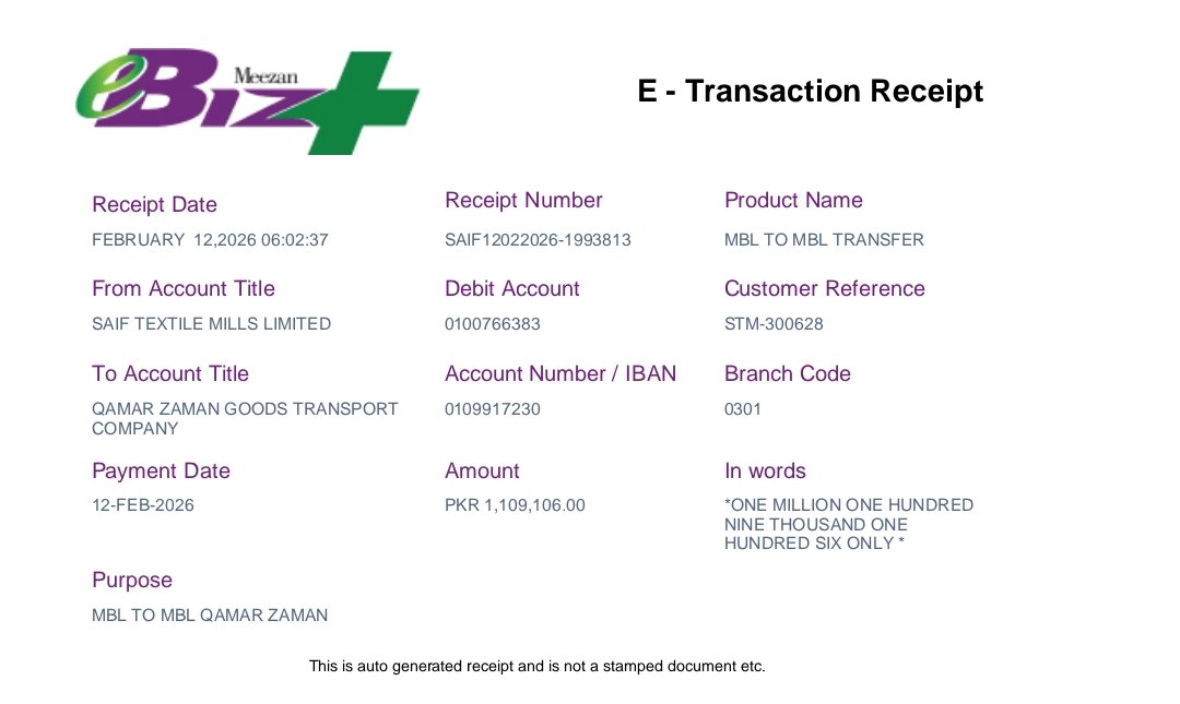 | 2025-04-21 | | 12840378 | SAIF TEXTILE MILLS LIMITED | GADOON | shahkot to gadoon | 10 | 596000 | 89400 | 685400 | 27416 | Online | 657984 | 2025-05-20 | Cheque | | 27416 | 89400 | |